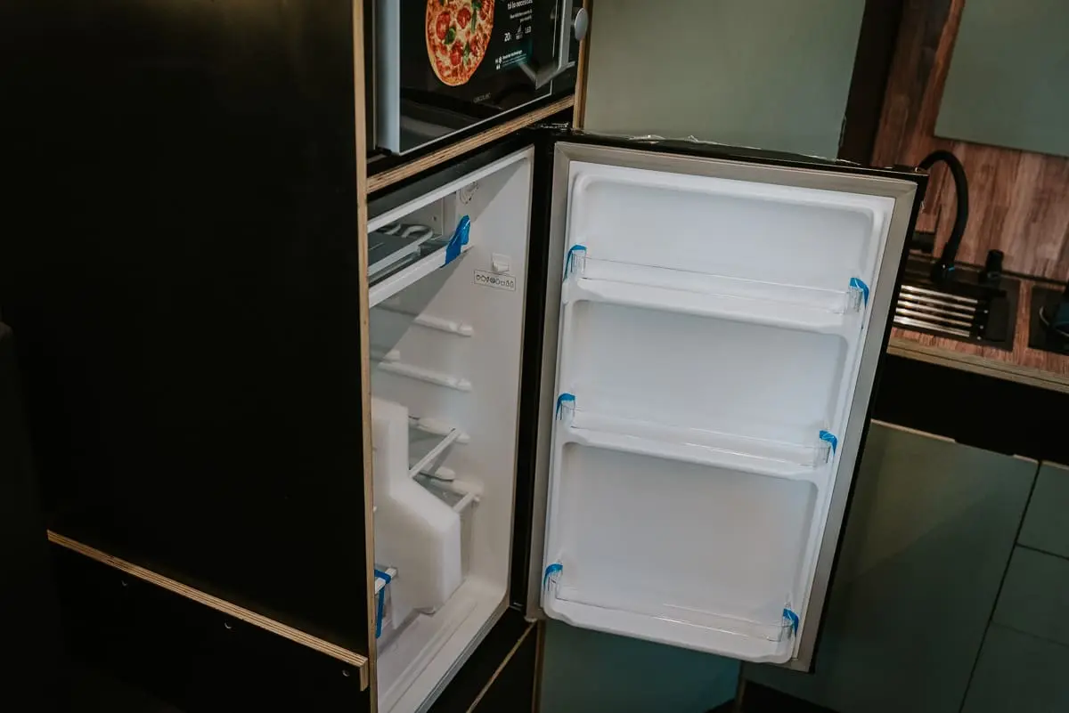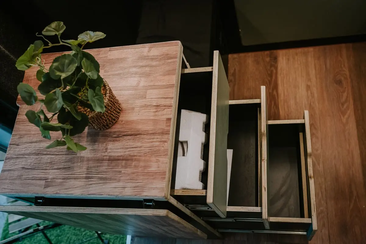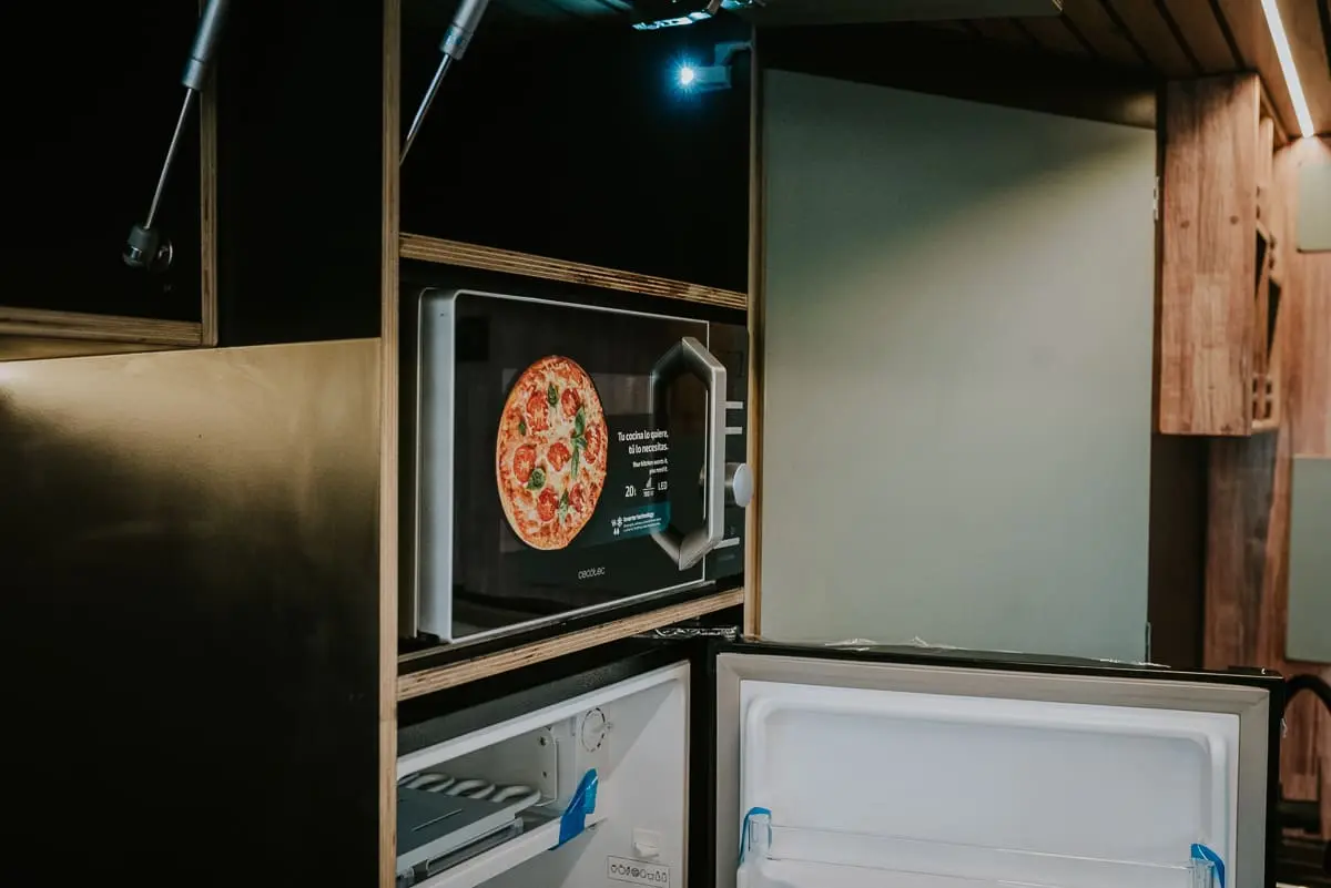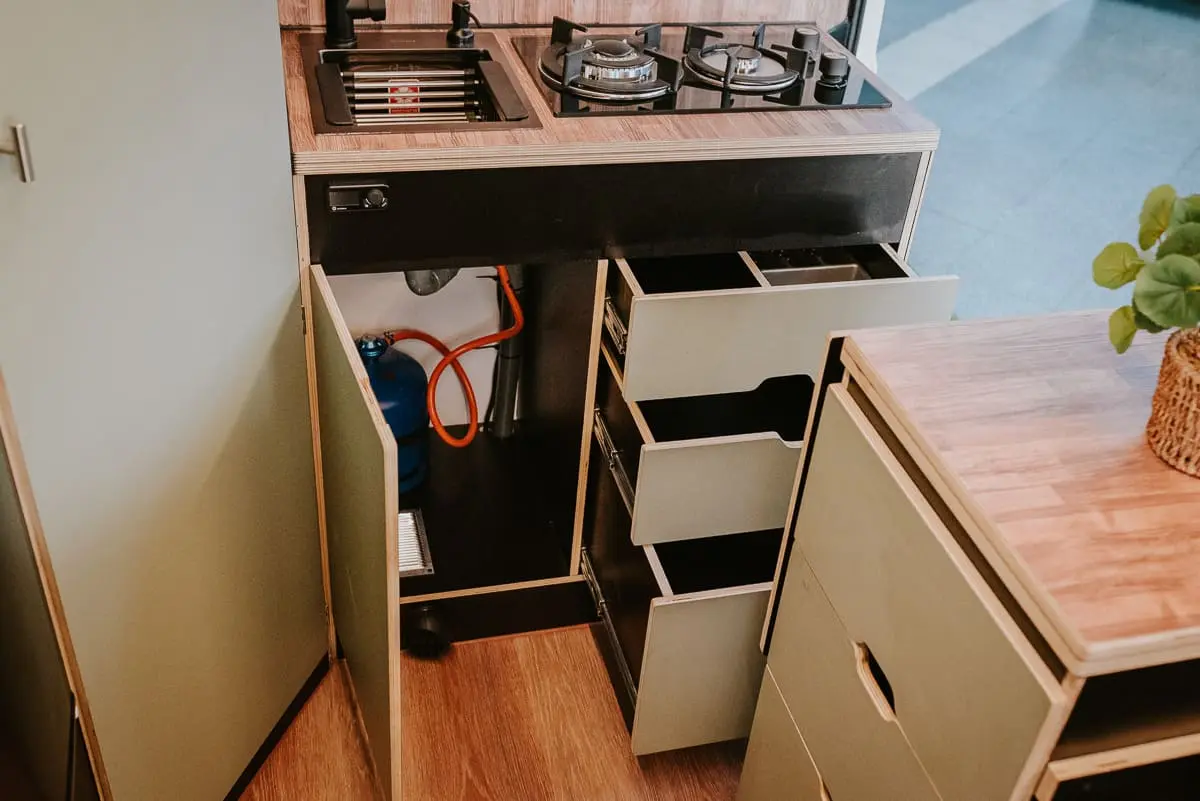 • Mueble con cajonera (espacio para nevera de hasta 100L y bombona de gas)